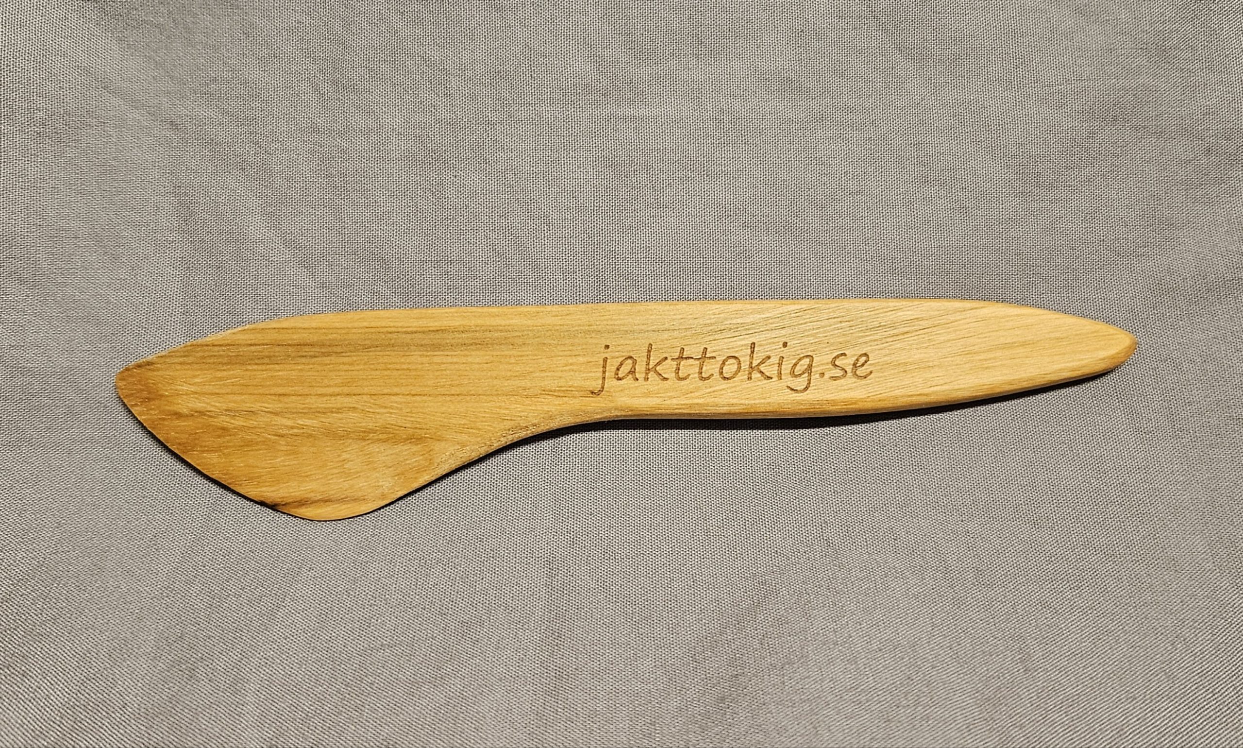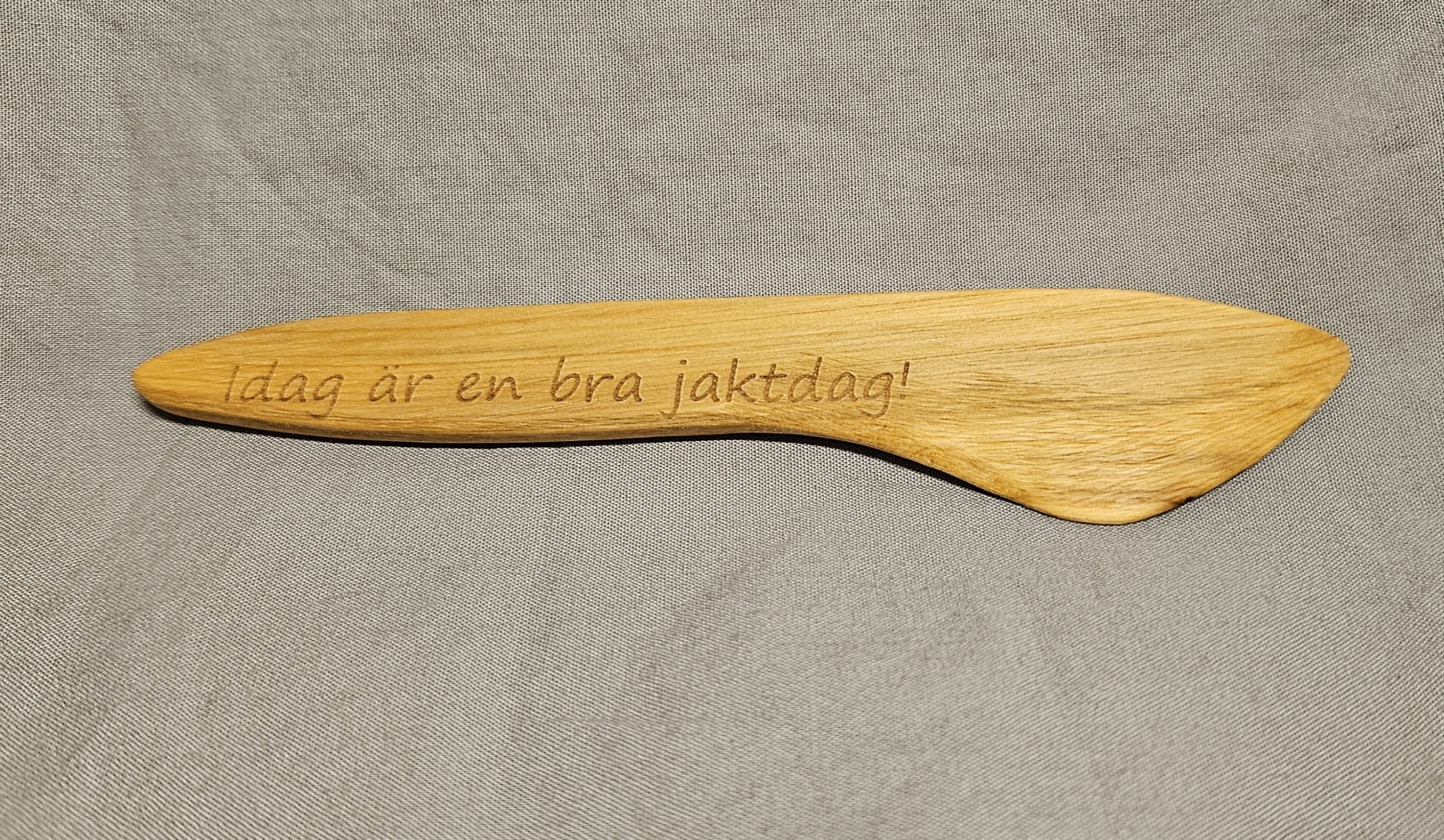 Handgjorda smörknivar i eneträ, lasergraverade: ”Idag är en bra jaktdag!” och ”Jakttokig.se ” på motsatt sida.
